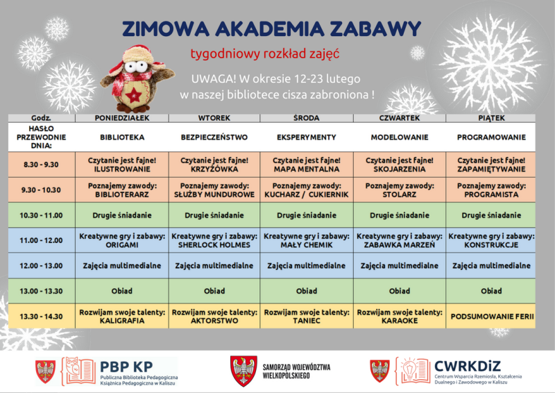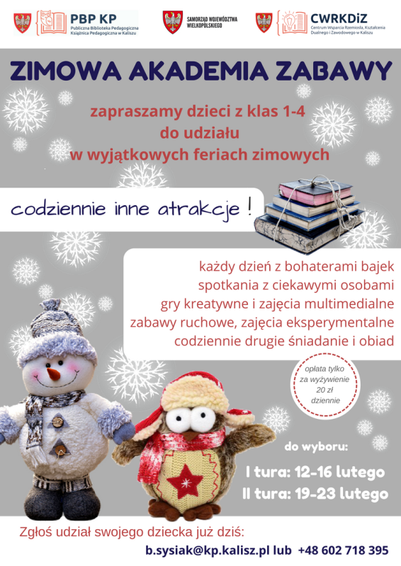 ZIMOWA AKADEMIA ZABAWY rusza już od 12 lutego ! Wspólnie z Centrum Wsparcia Rzemiosła, Kształcenia Dualnego i Zawodowego w Kaliszu w okresie ferii zimowych zapraszamy dzieci z klas 1-4 szkół podstawowych do udziału