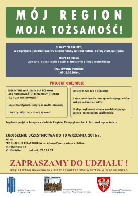 Książnica Pedagogiczna im. A. Parczewskiego w Kaliszu wraz z Kaliskim Towarzystwem Przyjaciół Nauk zaprasza szkoły do udziału w projekcie „Mój Region – Moja Tożsamość!”. Regulamin konkursu - pdf